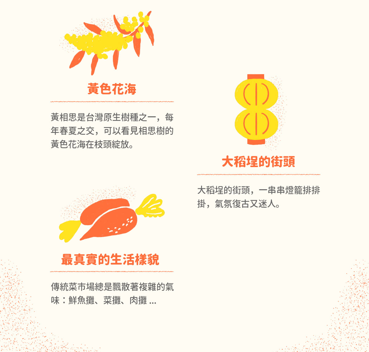 我們設計印花布、以及各式印花產品;我們的創作靈感來自自身在台灣的成長記憶、生態關懷、以及生活中被忽略的尋常事物。